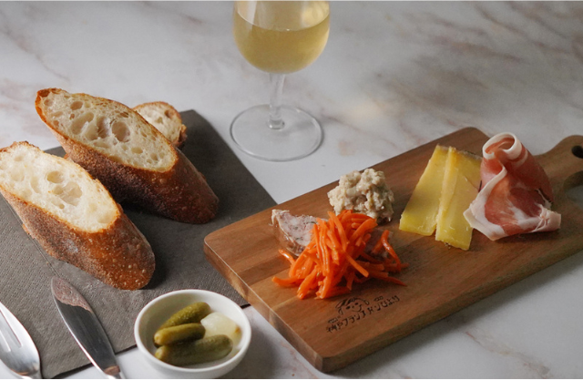 「コム・シノワ」荘司シェフのパテや「フロマジュリーミュウ」の12か月熟成のコンテチーズをはじめとするスペシャルなおつまみセットをフランスパンと自然派ワインとともに。