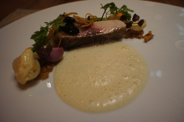 セップの泡ソース。 ジャガイモのピューレはトリュフ入り。