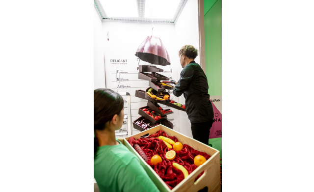 シェフにとって作品全てのコンセプトである「DELIGANT(デリシャスとエレガントの造語)」のアルファベットを型取った大きなチョコレートのパーツと、チョコレートで作ったパイプを柱のように重ねながら、下から絶妙な角度でパーツを積み上げていく田中シェフ。一文字一文字に込められたコンセプトアルファベット型のバスケットに本物かと疑う様なカラフルなフルーツや野菜で華やかに仕上げていきます。