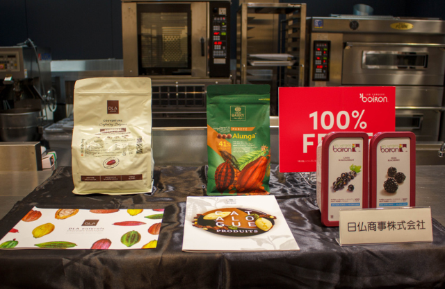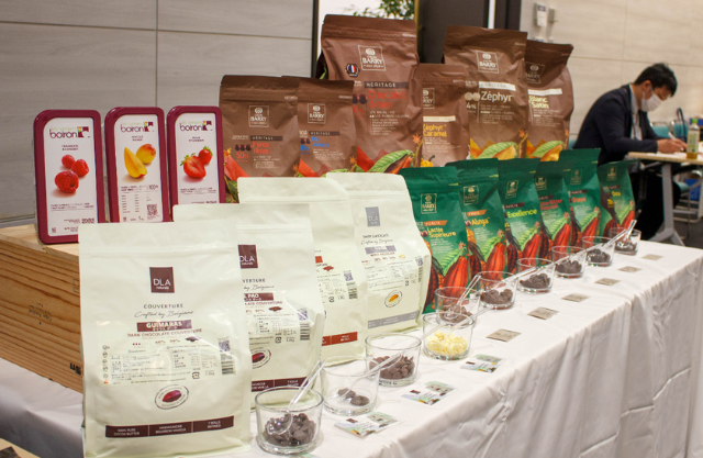 会場には、今回の指定材料であるカカオバリーとDLAナチュラルズのチョコレート、レ・ヴェルジェ・ボワロンのフルーツピューレが並び、参加者はテイスティングをしながら、それぞれの味わいと香りの違いを確かめていました。