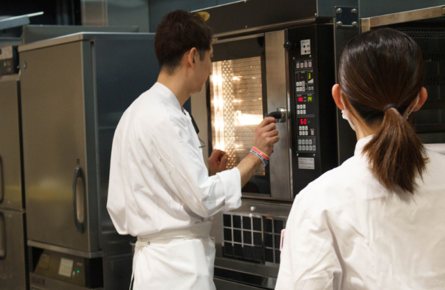 市原シェフはその特性を踏まえ、「焼成中に一度電源や送風を止めて膨らみすぎを抑え、再び温度を上げる」という工程を丁寧に繰り返し、理想の生地に導いていきます。扉を開けると庫内温度が約10℃下がることまで計算に入れ、温度変化を見越したコントロールが印象的でした。