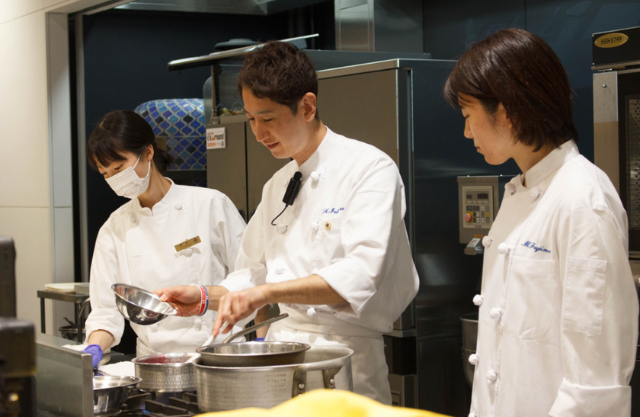 まずピューレを106〜107℃まで煮詰め、水分を飛ばして旨味を凝縮。シェフは「温度だけでなく泡の大きさ、鍋底の見え方、色の変化も見る」と温度計だけでなく状態を見極める感覚の大切さを強調しました。