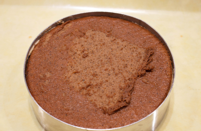 焼き面のままアンビバージュを打った後、パレットで表面をスッとならして余分を取り除く。スライスするより手間がかからず、断面がすっきり仕上がるとのこと。