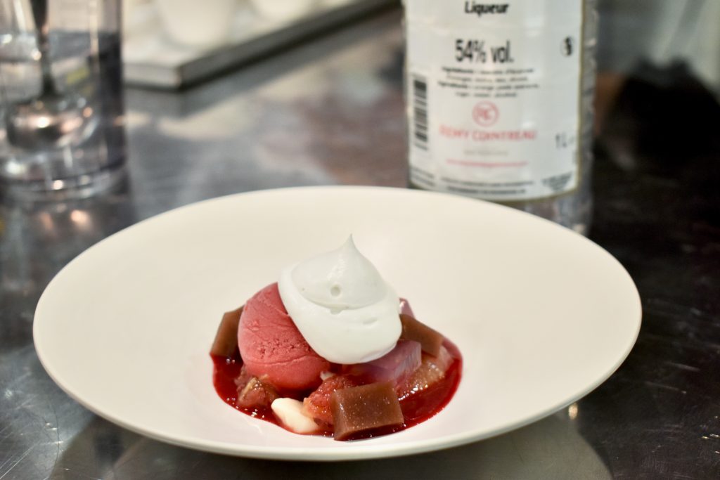 今回使用されたレミーコアントロー社の製品は5種類。製菓製パン向けに特化した日仏商事の特注品 「コアントロー54°」、「サンレミー ブランデーXO 60°」、「ザ・ボタニスト ジン60°」、「マウントゲイ ラム55°」、そしてアマレナチェリーのコアントロー漬け「アマレナ オ コアントロー 2.5°」です。