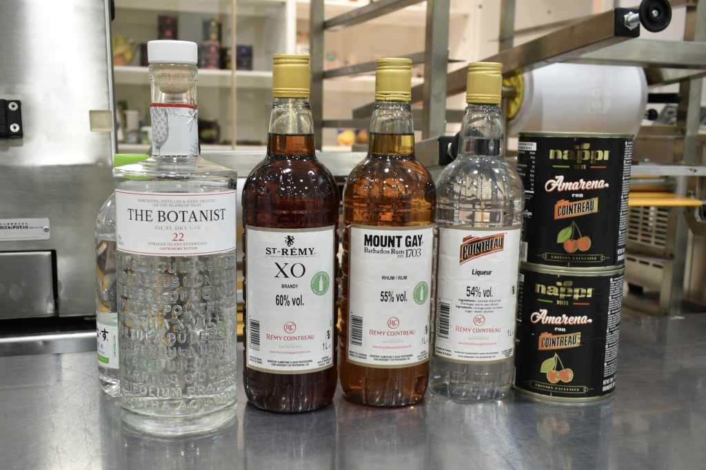 今回使用されたレミーコアントロー社の製品は5種類。製菓製パン向けに特化した日仏商事の特注品 「コアントロー54°」、「サンレミー ブランデーXO 60°」、「ザ・ボタニスト ジン60°」、「マウントゲイ ラム55°」、そしてアマレナチェリーのコアントロー漬け「アマレナ オ コアントロー 2.5°」です。