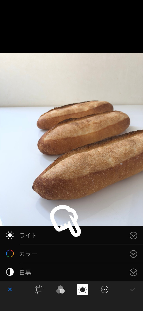 撮影した写真を表示させ、編集ボタンをタップ。詳細編集ボタンをタップして、ライトのボタンをタップ。明るさボタンをタップし、指でメモリをスライドさせ調整すれば明るさ調整が可能です。