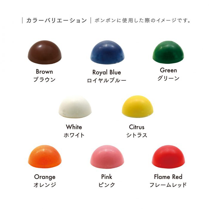食用の色素で色付けしたカカオバターです。チョコレートやクリームなどにそのまま混ぜて色づけしていただくのはもちろんのこと、エアブラシでお菓子に吹き付けることも可能です。電子レンジや湯煎、エチューブで容器ごと温めて溶かし(約35℃)、チョコレートやクリームなどの色付けにご使用ください。エアブラシで吹き付けたり、筆や刷毛などで絵付けに使用することもできます。